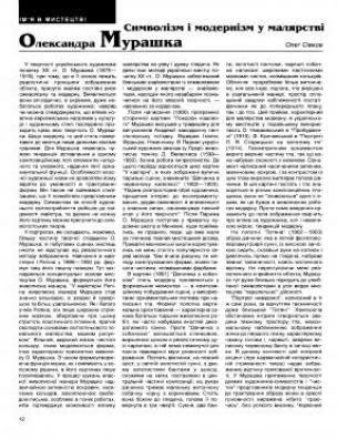Анотація: Статтю присвячено творчості українського живописця, педагога і громадського діяча Олександра Мурашка (1875–1919). Висвітлено основні етапи життєвого шляху художника. Проаналізовано риси символізму та модерну в малярському доробку Олександра Мурашка, зокрема в картинах «Дівчинка з собачкою» (1901), «Тетяна» (1902–1903), «Благовіщення» (1909), «Селянська родина» (1914) та ін.
