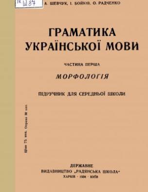 Граматика української мови [Електронна копія] : підруч. для серед. шк. / А. Шевчук, І. Бойків, О. Радченко. 2-ге, виправл. вид. Електрон. текст. дані. Харків ; Київ : Рад. шк., 1934 (Київ: НБУ ім. Ярослава Мудрого, 2019). Ч. 1 :