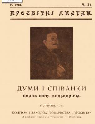 Анотація: «Просвітні листки» є однією з видавничих серій товариства «Просвіта», започаткованою 1907 року. Представлений випуск є збіркою вибраних дум і співанок українського письменника-романтика Осипа Федьковича (1834–1888). Вміщено портрет письменника та опубліковано статтю, у якій коротко висвітлено його життєвий і творчий шлях. Також надруковано покажчик змісту інших випусків серії «Просвітні листки».