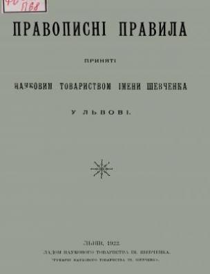 Бібліографічний опис: Правописні правила, приняті Науковим товариством імені Шевченка у Львові [Електронна копія]. Електрон. текст. дані (1 файл : 45,0 Мб). Львів : Накладом Наук. т-ва ім. Т. Шевченка, 1922 (Київ: НБУ ім. Ярослава Мудрого, 2019).