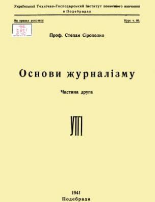 Основи журналізму : [курс лекцій] : на правах рукопису / Степан Сірополко ; Укр. техн.-господар. ін-т позаоч. навчання. Подєбради : УТГІ, [19--]- . Ч. 2 : Електрон. текст. дані (1 файл : 98,1 Мб). 1941 (Київ: НБУ ім. Ярослава Мудрого, 2019).