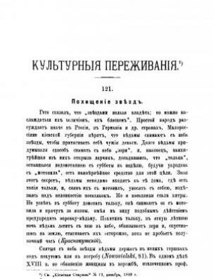 Анотація: Етнографічне дослідження українського фольклориста, етнографа, літературознавця Миколи Сумцова (1854–1922) «Культурные переживания», яке складається з 200 статей з питань духовної культури та побуту українців, друкувалося протягом 1889 та 1890 років у журналі «Киевская старина». У представленій публікації розглянуто окремі види ворожіння та різноманітні повір’я, пов’язані з демонічними створіннями. Подано список українських народних прикмет, що існують також в інших країнах.