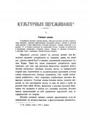 Анотація: Етнографічне дослідження українського фольклориста, етнографа, літературознавця Миколи Сумцова (1854–1922) «Культурные переживания», яке складається з 200 статей з питань духовної культури та побуту українців, друкувалося протягом 1889 та 1890 років у журналі «Киевская старина». У представленій публікації розглянуто історію вуличних кличок і прізвиськ, розказано про вміння українських знахарів заклинати змій.