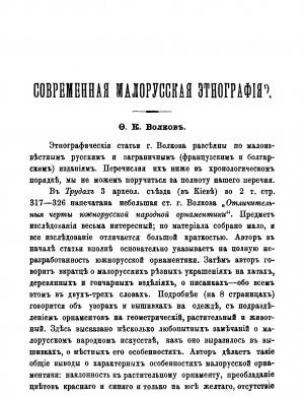 Бібліографічний опис: Сумцов, Н. Ф. Современная малорусская этнография [Електронна копія] : Ф. К. Волков : [см. ”Киевская старина” 1895 г., № 7 и 8] / Н. Ф. Сумцов // Киевская старина. 1895. Т. 50. Сентябрь. С. 88–96.