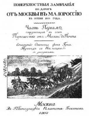 Бібліографічний опис: Поверхностные замечания по дороге от Москвы в Малороссию [Електронна копія] : пер. с нем с рисунками / сочинение Оттона фон Гуна. Електрон. текст. дані (1 файл : 18,9 Мб). М. : В Тип. Платона Бекетова, 1806 (Київ: НБУ ім. Ярослава Мудрого, 2011).