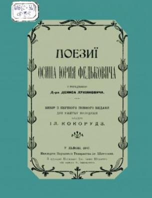 Поезії Осипа Юрія Федьковича [Електронна копія] : вибір з першого повного видання : для ужитку молодежи / зладив Іл. Кокорудз ; з передм. д-ра Д. Лукіяновича. Електрон. текст. дані (1 файл : 202 Мб). У Львові : Накладом Наук. т-ва ім. Шевченка, 1907 (Київ: НБУ ім. Ярослава Мудрого, 2019).