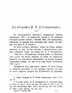 Анотація: Статтю історика, громадського й політичного діяча Миколи Василенка присвячено окремим сторінкам біографії видатного українського письменника, драматурга, культурного і громадського діяча Івана Котляревського (1769–1838). Вміщено та проаналізовано уривки з подорожніх нотаток невідомого автора, що були надруковані 1830 року в журналі «Отечественные записки» та містили відомості про Івана Котляревського, українців та українську мову. Статтю було опубліковано 1902 року в журналі «Киевская старина».
