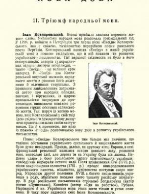 Анотація: Представлений розділ із праці «Історія української культури», що вийшла друком 1937 року під загальною редакцією Івана Крип’якевича, присвячено творчості видатного українського письменника, поета, драматурга, культурного і громадського діяча Івана Котляревського (1769–1838). Висвітлено основні факти біографії письменника та його внесок у розвиток української мови та літератури. Розділ написав письменник і літературознавець Володимир Радзикевич.