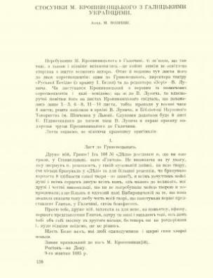 Анотація: Матеріал літературознавця і фольклориста Михайла Возняка присвячено стосункам видатного українського театрального діяча, актора, режисера і драматурга Марка Кропивницького (1840–1910) із галицькими культурними діячами. Надруковано листи Марка Кропивницького до директора театру «Руська бесіда» Івана Гриневецького та директора журналу «Зоря» Володимира Левицького (псевдонім – Василь Лукич). Матеріал було опубліковано 1929 року у виданні «Річник українського театрального музею».