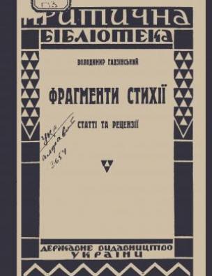 Фрагменти стихії [Електронна копія] : ст. та рец., 1921—1926 / Володимир Гадзінський. Електрон. текст. дані (1 файл : 119 Мб). [Б. м.] : Держ. вид-во України, 1927 (Вінниця: ВОУНБ ім. К. А. Тімірязєва, 2019). (Критична бібліотека).
