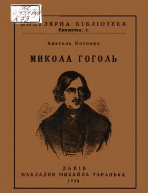 Микола Гоголь [Електронна копія] : біогр. нарис / Анатоль Котович. Електрон. текст. дані (1 файл : 8,07 Мб). Львів : Накладня Михайла Таранька, 1930 (Київ: НБУ ім. Ярослава Мудрого, 2020). (Популярна бібліотека; кн. 4).