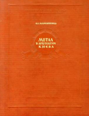 Анотація: Працю українського архітектора Олександра Маринченка, що вийшла друком 1948 року, присвячено питанням розвитку художньої обробки металу та її ролі в архітектурі Києва. Висвітлено історію художньої обробки металу в Києві з кінця XVII сторіччя до 1940-х років. Представлено понад сто фотографій та креслень металічних конструкцій, значна частина яких публікується вперше. Текст подано українською та російською мовами.