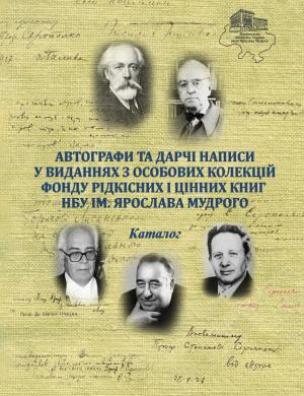 Анотація: У каталозі подано відомості про книги з автографами та дарчими написами з особових колекцій, що зберігаються у фонді рідкісних і цінних книг Національної бібліотеки України імені Ярослава Мудрого. Видання розраховано на науковців різних галузей знань, аспірантів, студентів, книгознавців, працівників бібліотек, інформаційних служб, видавництв, та стане в нагоді всім, хто цікавиться історією України та її культурою.