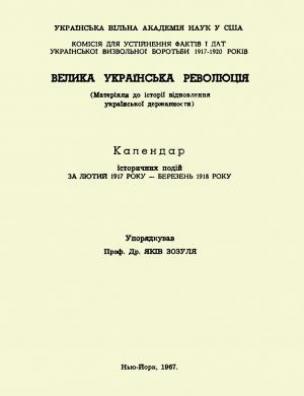 Бібліографічний опис: Велика українська революція [Електронна копія] : (матеріяли до історії відновлення укр. державности) : календар іст. подій за лют. 1917 р. – берез. 1918 р. / упоряд. Я. Зозуля ; Укр. віл. акад. навук у США, Коміс. для устійнення фактів і дат укр. визвол. боротьби 1917-1920 рр. Електрон. текст. дані (1 файл : 113 Мб). Нью-Йорк : [б. в.], 1967 (Київ: НБУ ім. Ярослава Мудрого, 2020).