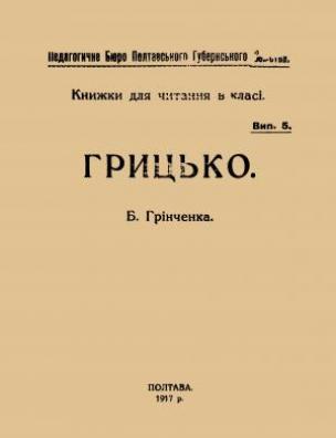 Грицько [Електронна копія] / Б. Грінченко ; Пед. бюро Полтав. губерн. земства. Електрон. текст. дані (1 файл : 6,96 Мб). Полтава : [б. в.], 1917 (Київ: НБУ ім. Ярослава Мудрого, 2020). (Книжки для читання в класі; вип. 5).