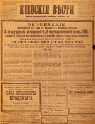 Бібліографічний опис: Киевские вести [Електронна копія] : ежеднев. лит.-полит., эконом. и обществ. газ. Киев : Тип. С. Г. Слюсаревского, 1908 (Київ : НБУ ім. Ярослава Мудрого). № 169 : Четверг, 26 июня (9). Електрон. текст. дані (1 файл : 24,0 Мб). 1908 (Київ: НБУ ім. Ярослава Мудрого, 2020).