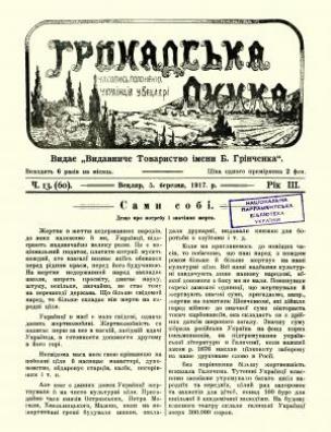 Бібліографічний опис: Громадська думка [Електронна копія] : часопис полонених українців у Вецлярі / видає ”Видавниче Товариство імені Б. Грінченка”. Вецляр : Друк. ”Союза Визволення України”, 1915 (Київ : НБУ ім. Ярослава Мудрого). Ч. 13 (60) (5 берез.) : Електрон. текст. дані (1 файл : 4,35 Мб). 1917 (Київ: НБУ ім. Ярослава Мудрого, 2021).