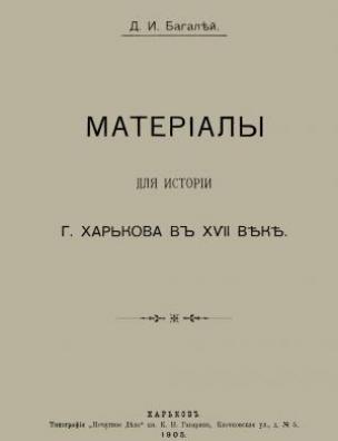 Материалы для истории г. Харькова в XVII веке [Електронна копія] / Д. И. Багалей. Электрон. текст. дан. (1 файл : 379 Мб). Харьков : Тип. ”Печат. дело”, 1905 (Київ: НБУ ім. Ярослава Мудрого, 2021).