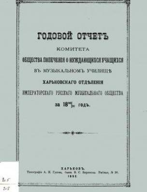 Годовой отчет комитета общества попечения о нуждающихся учащихся в музыкальном училище Харьковского отделения Императорского Русского музыкального общества за 1890/91 год [Електронна копія]. Электрон. текст. дан. (1 файл : 20,4 Мб). Харьков : Тип. А. Н. Гусева, вывш. В. С. Бирюкова, 1892 (Харків: ХДНБ ім. В. Г. Короленка, 2021).