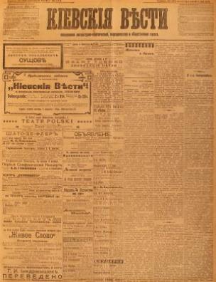 Бібліографічний опис: Киевские вести [Електронна копія] : ежеднев. лит.-полит., эконом. и обществ. газ. Киев : Тип. С. Г. Слюсаревского, 1908 (Київ : НБУ ім. Ярослава Мудрого). № 274 : Среда, 15 октября (28). Електрон. текст. дані (1 файл : 4,74 Мб). 1908 (Київ: НБУ ім. Ярослава Мудрого, 2021).