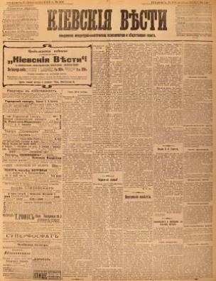 Бібліографічний опис: Киевские вести [Електронна копія] : ежеднев. лит.-полит., эконом. и обществ. газ. Киев : Тип. С. Г. Слюсаревского, 1908 (Київ : НБУ ім. Ярослава Мудрого). № 301 : Вторник, 11 ноября (24). Электрон. текст. дан. (1 файл : 16,9 Мб). 1908 (Київ: НБУ ім. Ярослава Мудрого, 2021).