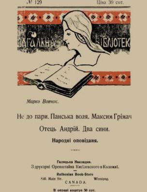 Не до пари ; Панська воля ; Максим Грімач ; Отець Андрій ; Два сини ; Данило Гурч [Електронна копія] : нар. оповідання / Марко Вовчок. Електрон. текст. дані (1 файл : 37,1 Мб). Коломия : Галиц. Накладня Якова Оренштайна в Коломиї, [1914?] (Київ: НБУ ім. Ярослава Мудрого, 2021). (Загальна бібліотека; № 129).