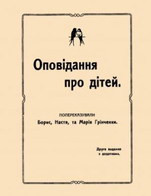 Бібліографічний опис: Оповідання про дітей [Електронна копія] / попереказували Б., Н. та М. Грінченки. 2-ге вид. Електрон. текст. дані. Київ : [б. в.], 1917 (Київ: НБУ для дітей, 2022). (Бібліотека «Молодість»; т. 11).
