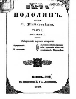 Быт подолян [Електронна копія] / К. Шейковского. Електрон. текст. дані. К. : В тип. И. и А. Давиденко, 1859- . Т. 1, вып. 1 : Электрон. текст. дан. (1 файл : 5,1 Мб). Киев : В тип. И. и А. Давиденко. 1859 (Київ: НБУ ім. Ярослава Мудрого, 2011).