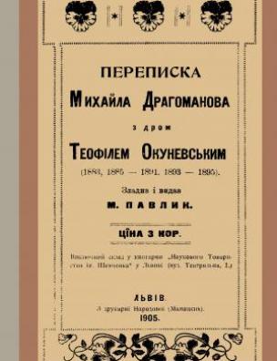 Анотація: У виданні, що вийшло друком 1905 року, представлено листування українського науковця, публіциста і громадського діяча Михайла Драгоманова (1841–1895) з юристом, дипломатом, громадським і політичним діячем Теофілем Окуневським (1858–1937). Опубліковані матеріали є одним з основних джерел історії українського національного руху наприкінці ХІХ сторіччя. Уклав видання та написав вступну статтю Михайло Павлик, публіцист, громадсько-політичний діяч, збирач та дослідник спадщини Михайла Драгоманова.