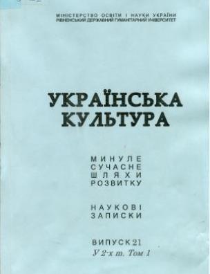 Оригінал друкованого документа зберігається в РОУНБ: Українська культура: минуле, сучасне, шляхи розвитку : наук. зб. Вип. 21, т. 1 / М-во освіти і науки України, Рівнен. держ. гуманітар. ун-т, Нац. Акад. мистецтв України, Ін-т культурології ; за заг. ред. В. Г. Виткалов. — Рівне : РДГУ, 2015. – 190 с.
