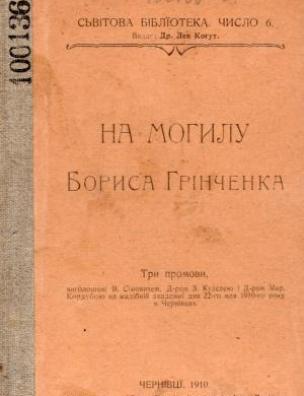 Бібліографічний опис: На могилу Бориса Грінченка [Електронна копія] : три промови, виголошені В. Сімовичем, д-ром З. Кузелею і д-ром Мир. Кордубою на жалобній академії дня 22 мая 1910-го року в Чернівцях. Електрон. текст. дані (1 файл : 21,1 Мб). Чернівці : З друк. ”Руська Рада”, 1910 (Харків: ХДНБ ім. В. Г. Короленка, 2025). (Світова бібліотека / вид. Лев Когут; число 6).