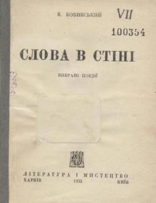 Бібліографічний опис:Бобинський, Василь. Слова в стіні [Електронна копія] : вибрані поезії / В. Бобинський. Електрон. текст. дані (1 файл : 67,0 Мб). Харків ; Київ : Літ. і мистецтво, 1932 (Одеса: ОННБ, 2025). Оригінал друкованого документа зберігається в ОННБ: Бобинський В. Слова в стіні : вибрані поезії / В. Бобинський. – Харків ; Київ : Літ. і мистецтво, 1932. – 119 с.