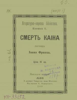 Оригінал друкованого документа зберігається в ОННБ: Франко І. Смерть Каїна / легенда Івана Франка. – Львів : З друк. Т-ва ім. Шевченка, 1889. – 48 с. – (Літературно-наукова бібліотека ; кн. 3).