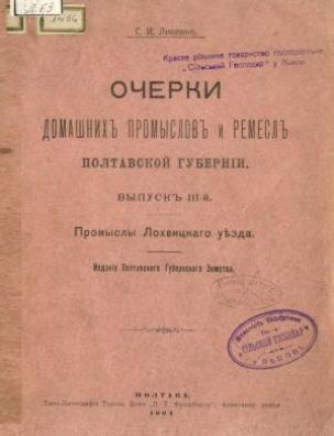 Очерки домашних промыслов и ремесл Полтавской губернии [Электронная копия] / С. И. Лисенко. Электрон. текст. дан. Полтава : Изд. Полтав. Губерн. Земства, [190-]- (: Типо-литогр. Торгов. Дома ”Л. Т. Фришберг”). Вып. 3 :