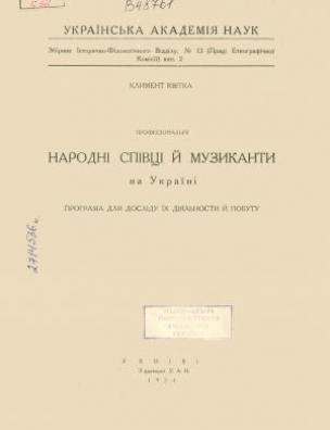 Професіональні народні співці й музиканти на Україні [Електронна копія] : прогр. для досліду їх діяльн. й побуту / Климент Квітка. Електрон. текст. дані (1 файл : 43,5 Мб). У Київі : З друк. У.А.Н., 1924 (Київ: НБУ ім. Ярослава Мудрого, 2011). (Збірник Історично-Філологічного Відділу. Праці Етнографічної Комісії / Укр. акад. наук |v № 13; вип. 2).