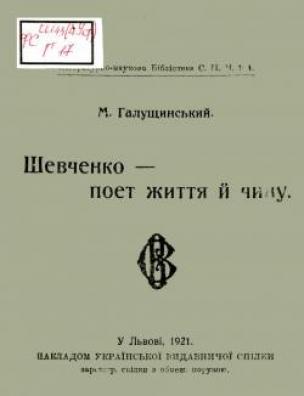 Шевченко – поет життя й чину [Електронна копія] / М. Галущинський. Електрон. текст. дані (1 файл : 12,4 Мб). У Львові : Накладом Укр. вид. спілки, 1921 (Київ: НБУ ім. Ярослава Мудрого, 2017). (Літературно-наукова бібліотека. Серія 2; ч. 164).