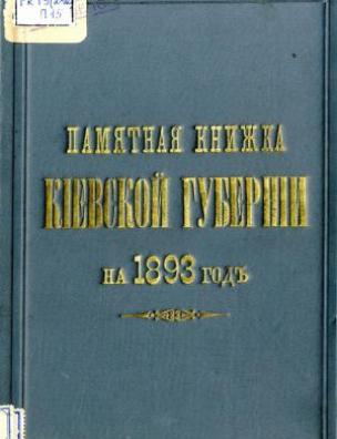 Бібліографічний опис: Памятная книжка Киевской губернии на 1893 год [Електронна копія]. Электрон. текст. дан. (1 файл : 82,9 Мб). Киев : Изд. Киев. Губерн. Стат. Ком., 1893 (Київ: НБУ ім. Ярослава Мудрого, 2017).