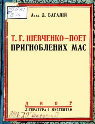 Оригінал друкованого документу зберігається в НБУ ім. Ярослава Мудрого: Багалій Д. Т. Г. Шевченко – поет пригноблених мас / Д. Багалій. — Харків : ДВОУ : Л-ра і мистец., 1931. – 102 с.