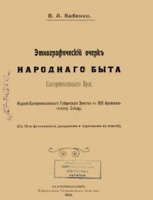 Этнографический очерк народного быта Екатеринославского Края [Електронна копія] / В. А. Бабенко. Электрон. текст. дан. (1 файл : 46,0 Мб). Екатеринослав : Тип. Губерн. Земства, 1905 (Київ: НБУ ім. Ярослава Мудрого, 2011).