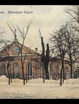 На листівці зображено євангельсько-лютеранську німецьку кірху.