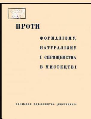 Бібліографічний опис: Проти формалізму, натуралізму і спрощенства в мистецтві [Електронна копія] : [зб. ст. / літред. Ф. Гаєвський]. Електрон. текст. дані (1 файл : 23,6 Мб). Київ : Мистецтво, [1936?] (Київ: НБУ ім. Ярослава Мудрого, 2011). Оригінал друкованого документу зберігається в НБУ ім. Ярослава Мудрого: Проти формалізму, натуралізму і спрощенства в мистецтві : [зб. ст. / літред. Ф. Гаєвський]. — Київ : Мистецтво, [1936?]. – 136, [3] с.