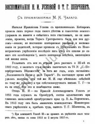 Бібліографічний опис: Зарянко, Н. Воспоминания Н. И. Усковой о Т. Г. Шевченке [Електронна копія] : с прим. М. К. Чалого / Н. Зарянко // Киевская старина. 1889. Т. 24. Февраль. С. 297-313.
