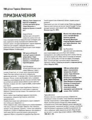 Анотація: Із нагоди 190-річчя з дня народження Шевченка проаналізовано чотири фільми про Тараса Григоровича, що вийшли на екрани у різні роки. Опубліковано думки, враження та переживання акторів, які зіграли у цих фільмах головну роль. Своїми спогадами поділися Амвросій Бучма, Сергій Бондарчук, Іван Миколайчук та Тарас Денисенко.