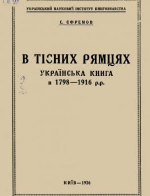 В тісних рямцях [Електронна копія] : укр. кн. в 1798–1916 рр. / С. Єфремов ; Укр. наук. ін-т книгознавства. Електрон. текст. дані (1 файл : 18,1 Мб). Київ : [б. в.], 1926 (Київ: НБУ ім. Ярослава Мудрого, 2011). Бібліогр. у підрядк. прим.