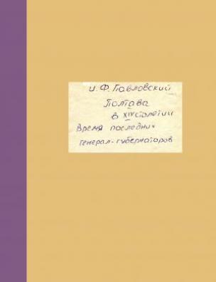 Анотація: Історик та педагог І. Ф. Павловський (1851–1922) є автором кількох цінних досліджень з історії Полтавщини. Ця праця присвячена історії Полтави, а саме: 1834–1856 рр. У 12 главах розглядаються питання зростання й упорядкування міста, міського самоврядування, організації охорони здоров’я та освіти, доброчинності та розвитку мистецтва. Головними джерелами для дослідження послужили матеріали міського архіву, журнали міської думи, архів губернського правління.