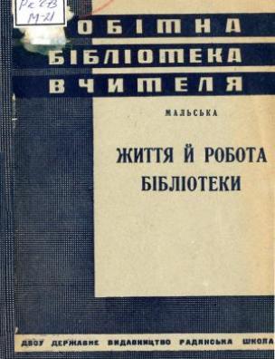 Життя й робота бібліотеки [Електронна копія] / Мальська. Електрон. текст. дані. Харків : Рад. шк., 1931 (Київ: НБУ ім. Ярослава Мудрого, 2011). (Робітна бібліотека вчителя).