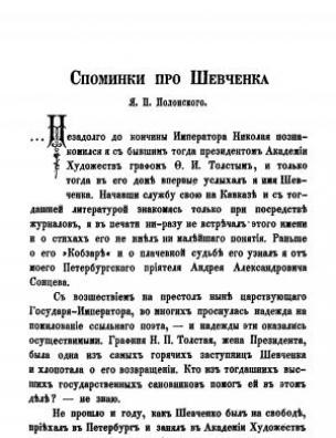 Анотація: Представлено спогади літератора і поета Якова Полонського про Тараса Шевченка. Описано знайомство, що відбулося у тодішнього президента Художньої академії графа Толстого, зустрічі та відвідини Шевченкової «низенької кімнатки». Наведено інформацію про зовнішній вигляд і характер Шевченка, його уподобання. Названо найкращі (на думку автора спогадів) малюнки та ін.
