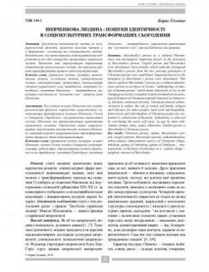 Анотація: Досліджено шевченківську людину як культурологічний феномен, визначено важливі чинники у її формуванні: гоголівська та сковородинська людина. Встановлено, чим шевченківська людина радикально відрізняється від обох попередніх прототипів української людини. Визначено нові соціокультурні перспективи ідентичності шевченківської людини, які пережили руйнівні трансформаційні процеси доби індустріалізації.