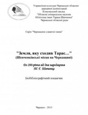 Бібліографічний опис: ”Земля, яку сходив Тарас …” [Електронна копія] : (Шевченківські місця на Черкащині) : до 200-річчя від дня народж. Т. Г. Шевченка : біобібліогр. покажч. / Комун. закл. ”Обл. універс. наук. б-ка ім. Тараса Шевченка” Черкас. облради ; уклад. Л. Т. Демченко. Електрон. текст. дані (1 файл : 1,69 Мб). Черкаси : ОУНБ, 2013 (Черкаси: ЧОУНБ ім. Т. Г. Шевченка, 2015). (Серія ”Черкащини славетні імена”).