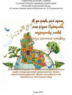Бібліографічний опис: Я до тебе, мій краю, моя рідна Сумщино, незрадливу любов крізь життя пронесу [Електронна копія] : метод. поради бібл. працівникам щодо популяризації краєзн. знань серед користувачів-дітей мол. та серед. шк. віку / Упр. культури і туризму Сум. облдержадмін., Обл. комун. закл. ”Сум. обл. дит. б-ка ім. М. Островського” ; склала Піддубна Н. М. Електрон. текст. дані (1 файл : 2,67 Мб). Суми : [б. в.], 2015 (Суми: Сумська обл. дитяча б-ка, 2015).